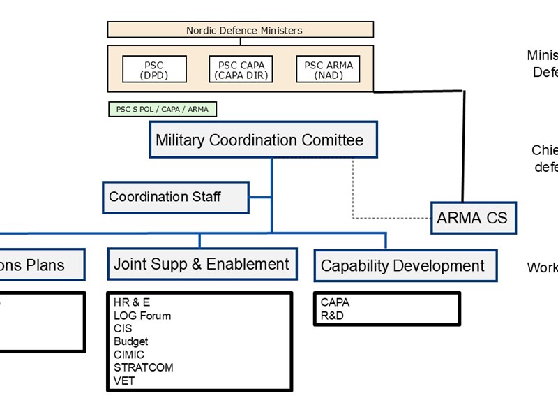 At the top of the political level are the Nordic ministers of defence who meet twice a year. The day-to-day work at the political level is carried out by the Political Steering Committee (PSC). The PSC consists of four subcommittees on policy, operations, capabilities and armaments, as well as the PSC Secretariat, which functions as the executive staff of the PSC.